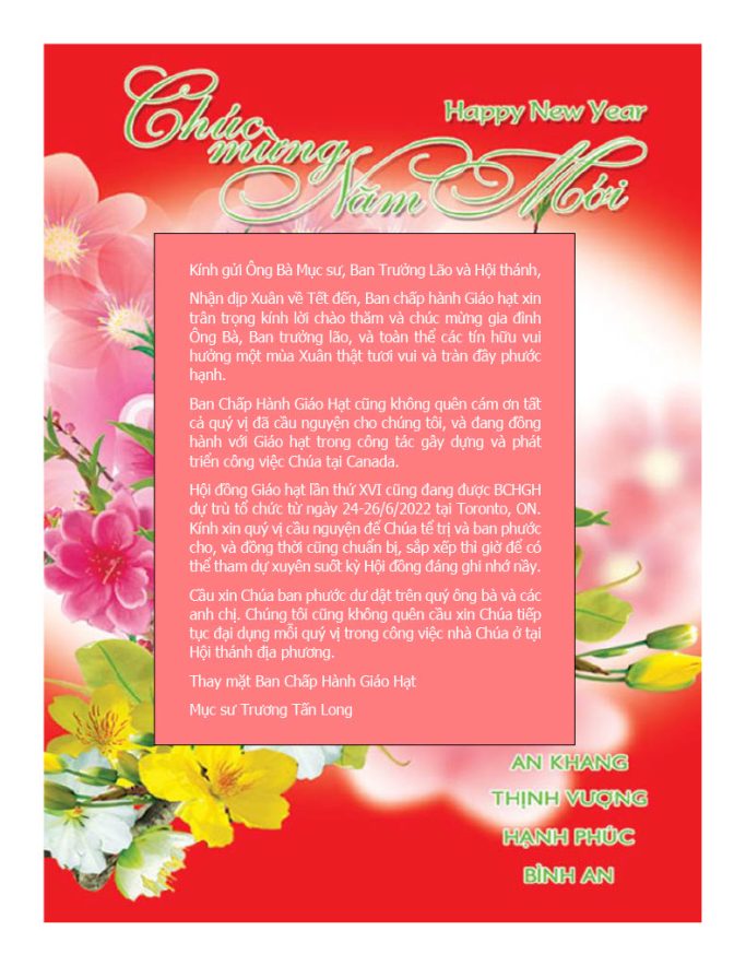 Kính gửi Ông Bà Mục sư, Ban Trưởng Lão và Hội Thánh, Nhân dịp Xuân về Tết đến, Ban chấp hành Giáo hạt xin trân trọng kính lời chào thăm và chúc mừng gia đình Ông Bà…