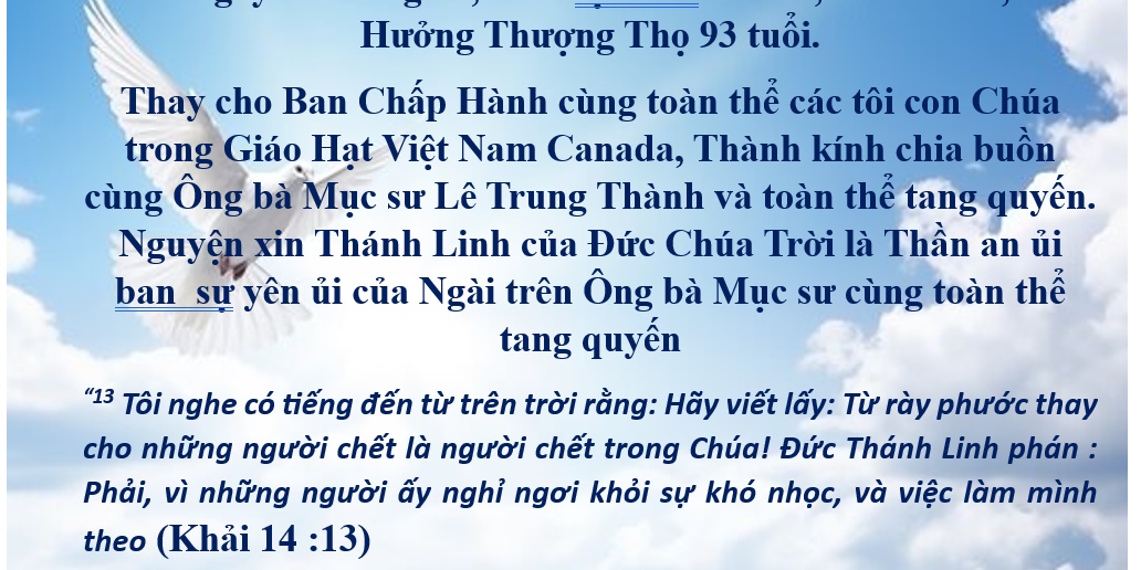 Jan292026Thông Báo Chia sẻ Share on FacebookShare on Facebook Share on XShare on X Pin itShare on Pinterest Share on LinkedInShare on LinkedIn Post navigationPreviousPrevious post:Previous PostNextNext post:CÁO PHÓ: GIA PHỤ MỤC SƯ LÊ TRUNG THÀNHBài viết liên quanCÁO PHÓ: GIA PHỤ MỤC SƯ LÊ TRUNG THÀNHJanuary 29, 2026THƯ PHÂN ƯU CÙNG MỤC SƯ TOÀN VÀ GIA ĐÌNHDecember 23, 2024THƯ PHẦN ƯU CỦA GIÁO HẠT VIỆT NAM CANADADecember 15, 2024CÁO PHÓDecember 15, 2024CHÚNG MỪNG GIÁNG SINHDecember 14, 2024THÔNG BÁO- HUẤN LUYỆN TRƯỞNG LÃODecember 13, 2024Thông báo Đại Hội Đồng Giáo Hạt Tin Lành Việt Nam CanadaApril 15, 2024Chúc Mừng Giáng Sinh 2022December 7, 2022Thư chúc Tết âm lịch 2022 từ Mục sư Trương Tấn LongJanuary 29, 2022